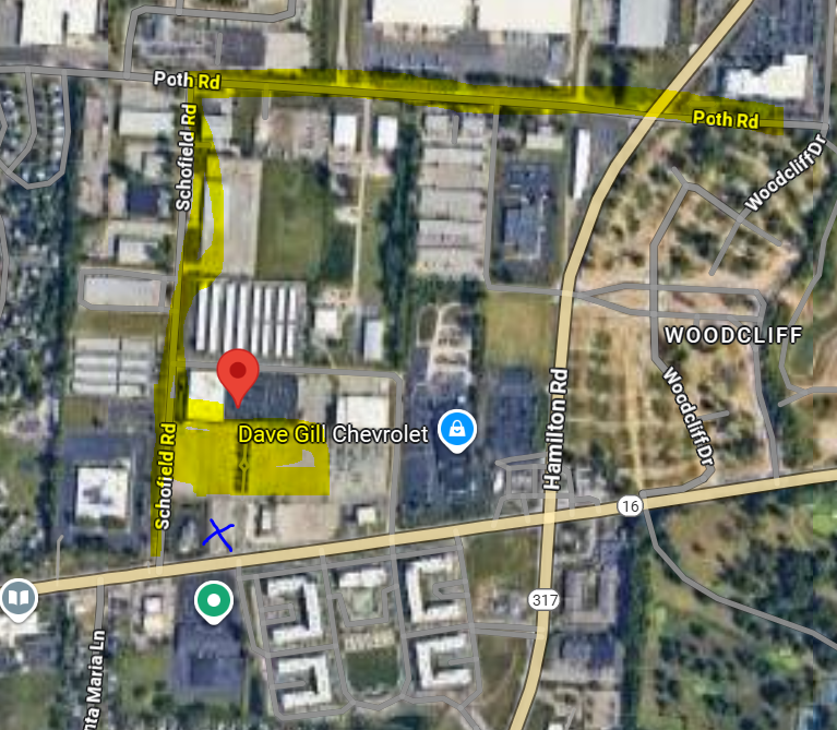 Use Poth Rd and take a left on Schofield Rd to enter the service road leading into the parking lot. Below is a map for an alternative route.